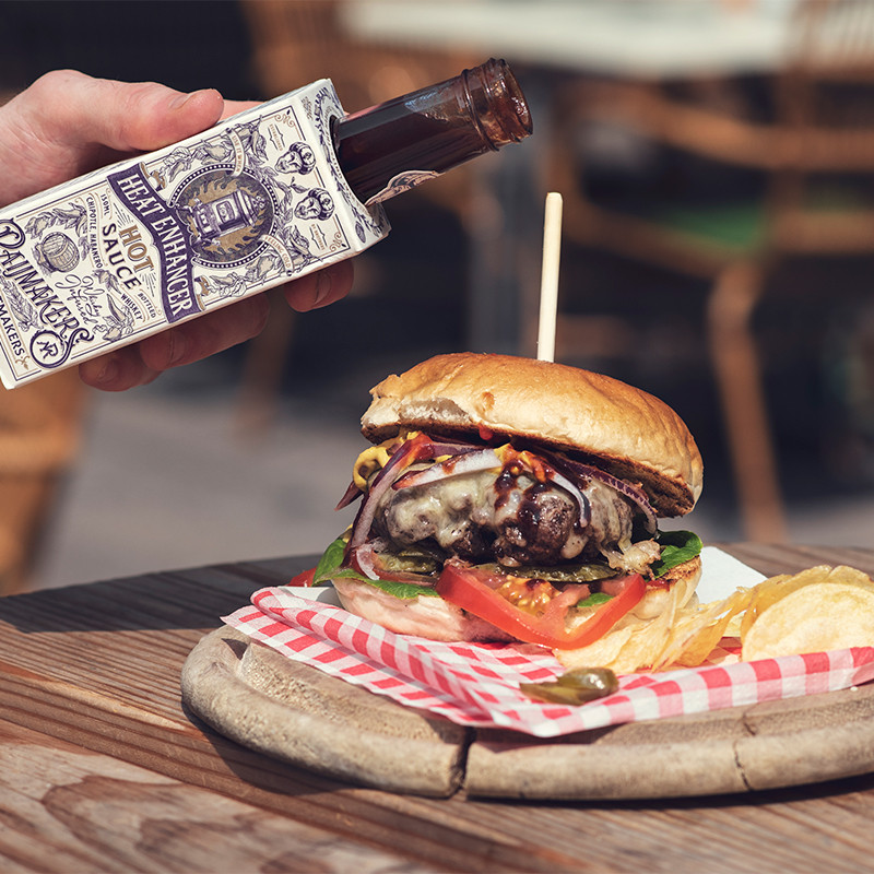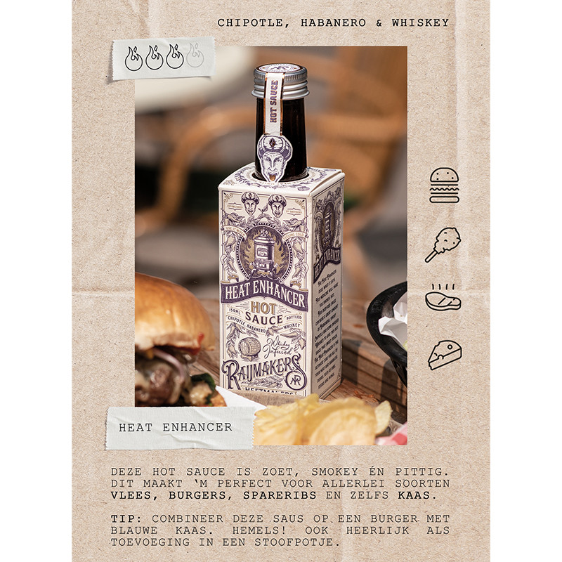 Met de Heat Enhancer van Raijmakers Heetmakers voel je je absoluut smokin hot. Het bevat een grote hoeveelheid habanero’s (30%), rokerige chipotle en wat whisky om deze hete saus een zoete toets te geven. Deze winnaar van de Duitse Chili Award ‘Best Hot Sauce’ 2019 is de ultieme aanvulling bij al je vlees- en barbecuegerechten, zoals ribben, steaks en vleugels. Past ook goed in stoofschotels.